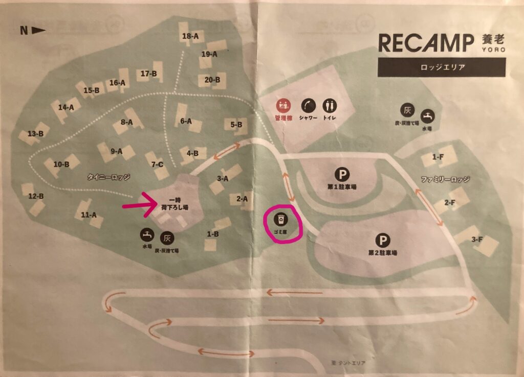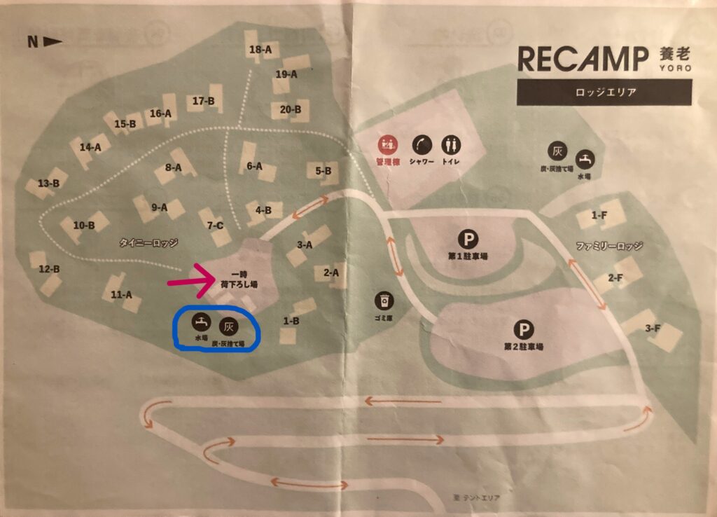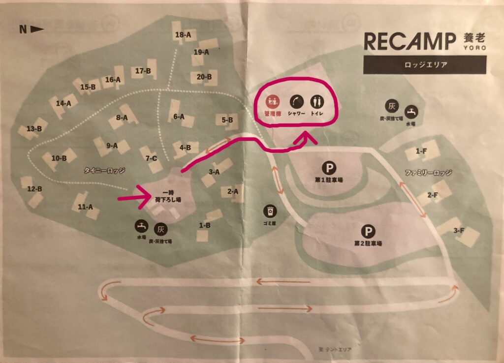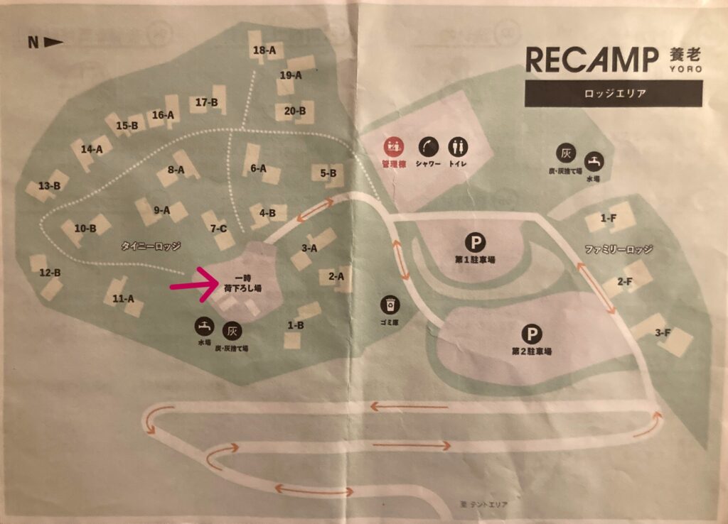場所はロッジエリアだと一時荷下ろし駐車場内にあります。