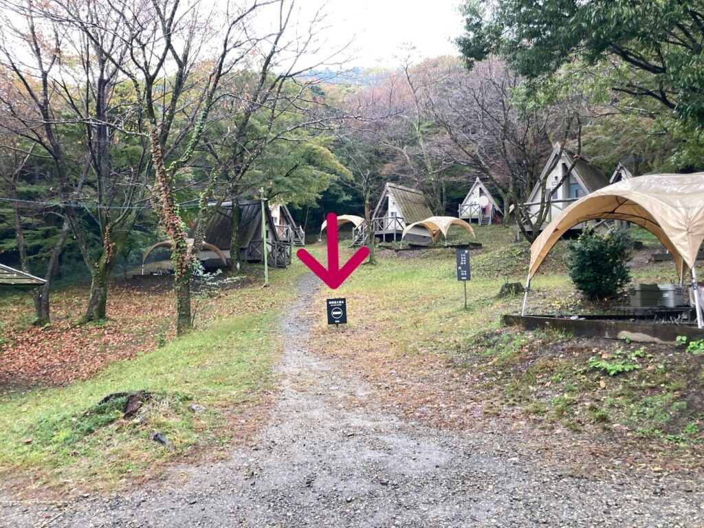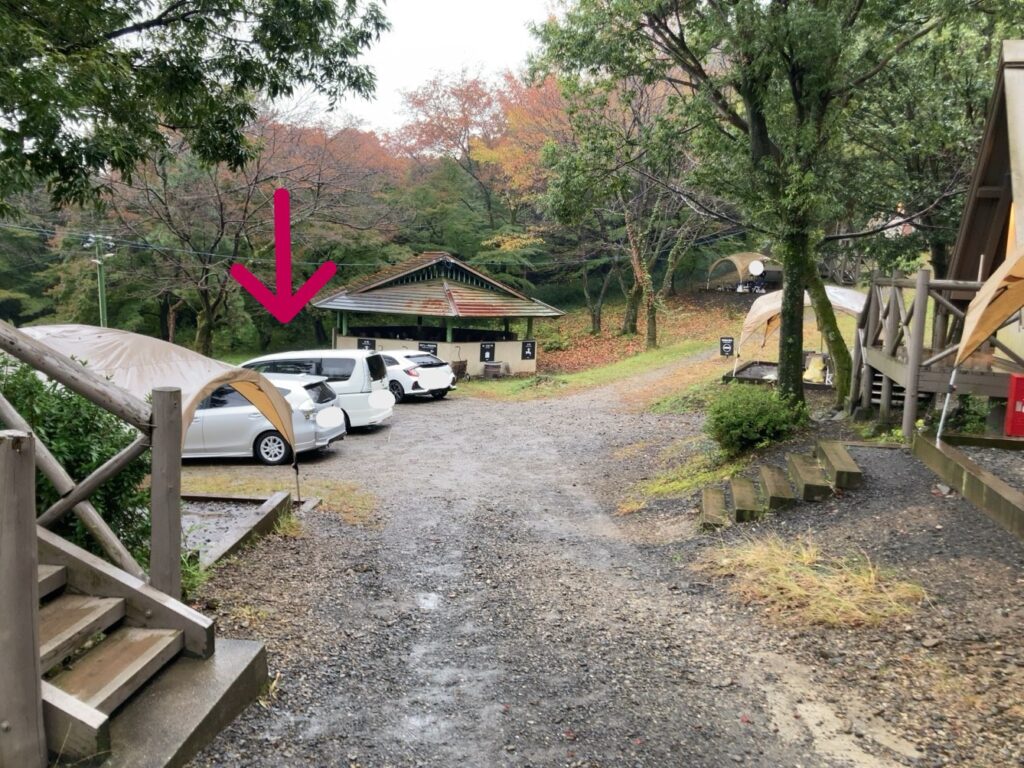 下の写真の赤い矢印の箇所が「タイニーロッジエリアの荷下ろしエリア」になります。