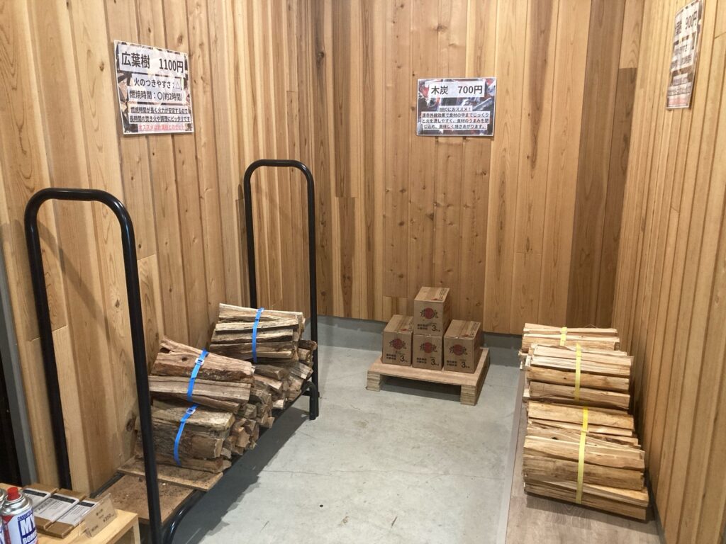 売店には薪や炭なども置いています。薪の値段は900円から1100円と少し割高ではありますので事前に購入してきた方が良いと思われます。