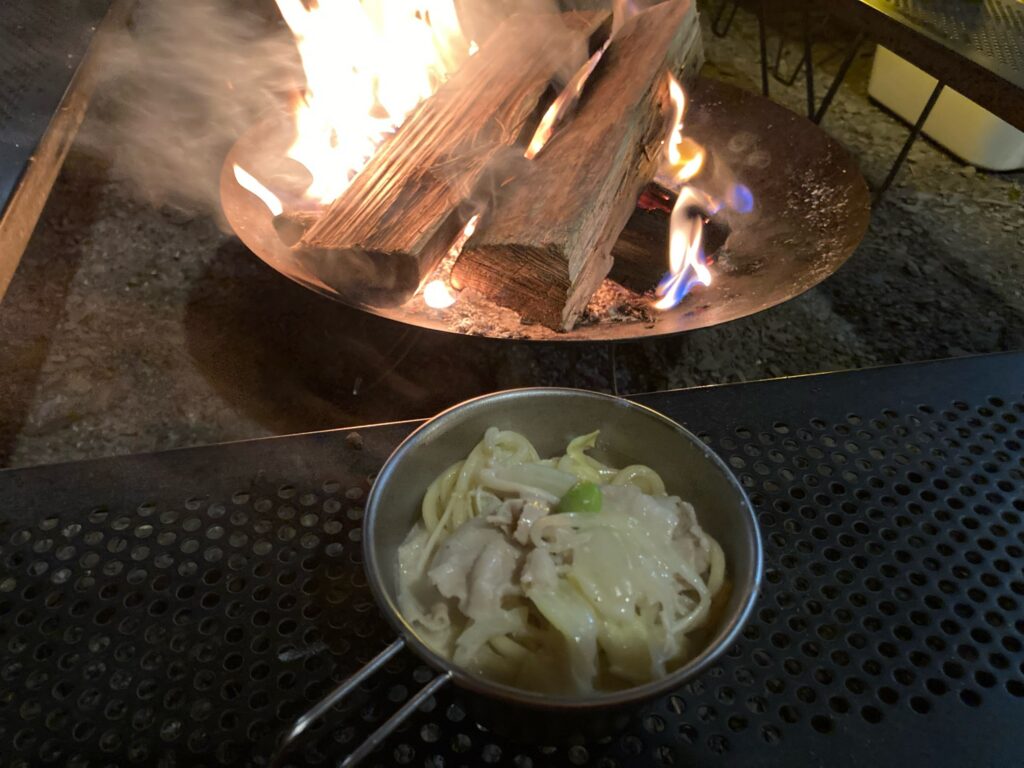 たき火と共に食べるちゃんぽんは格別です。更に体が温まる!!