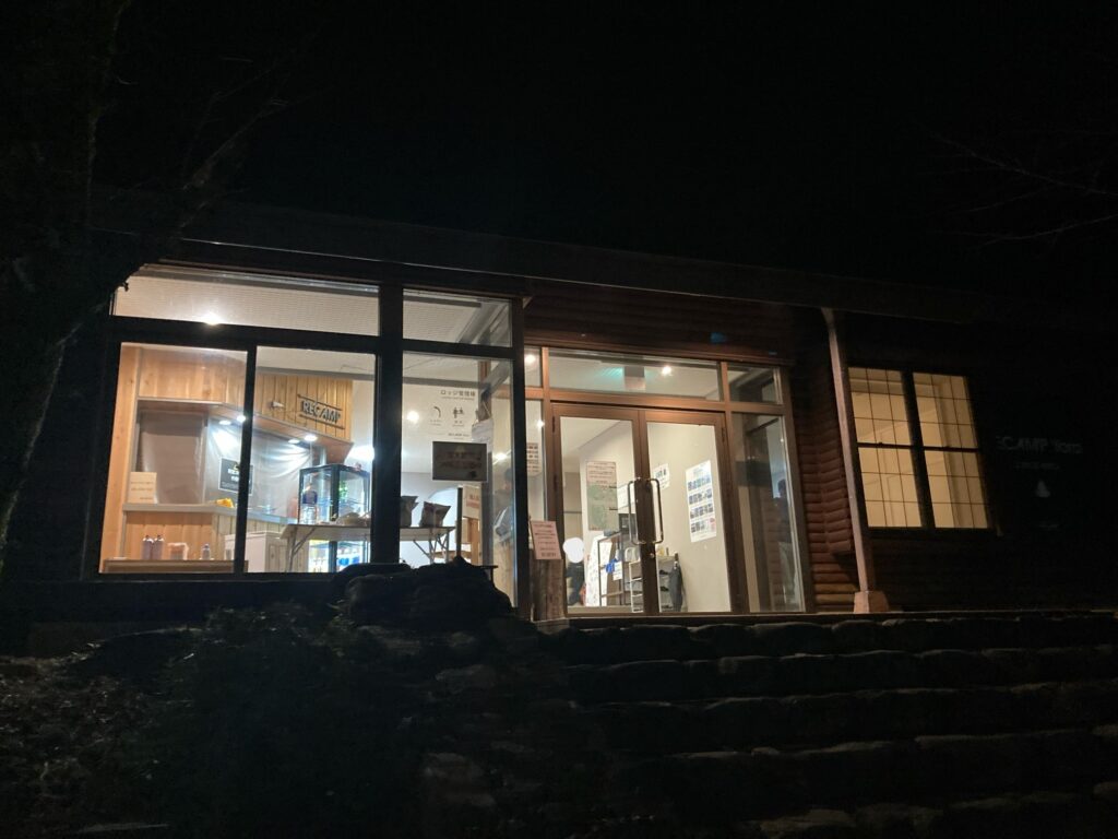 ロッジ管理棟の夜の正面入り口はこんな感じです。