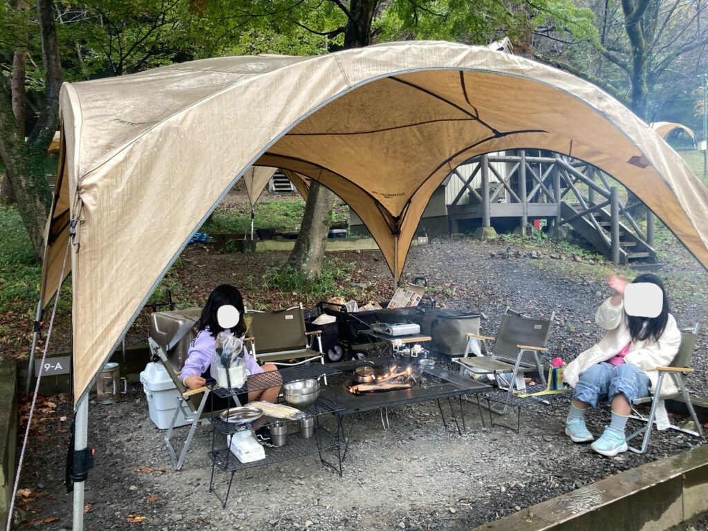 13,000円はオートサイトと比較すると高く感じるかもしれませんが、ロッジの横にはタープ付きのスペースがあり雨でもその下でたき火や食事が楽しめるという素晴らしいサイトでありました!