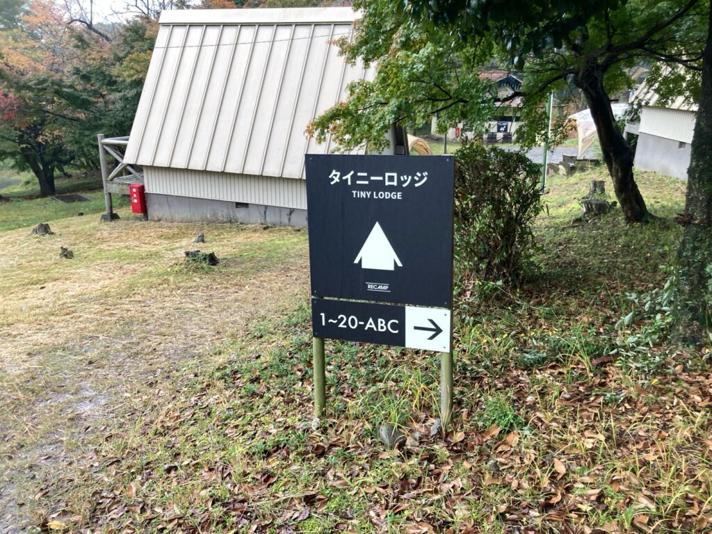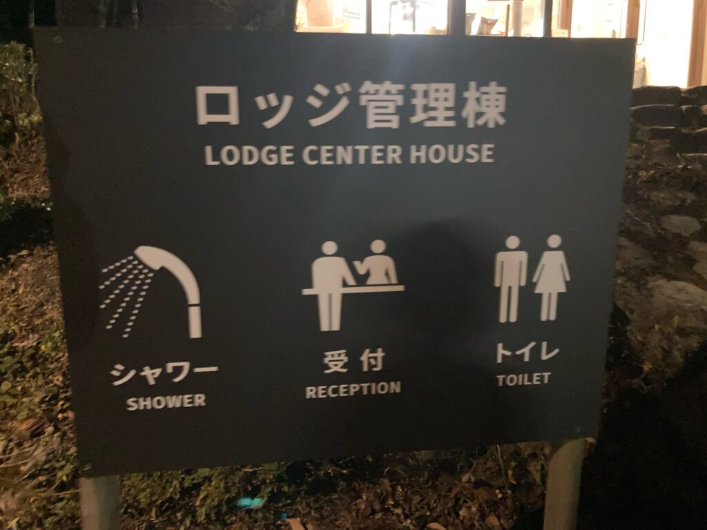 ロッジ用管理棟の前にはこの看板が立っており、管理棟の灯りは24時間ついてます。ロッジから歩いて行っても灯りがついているので場所が分かりやすいです。
