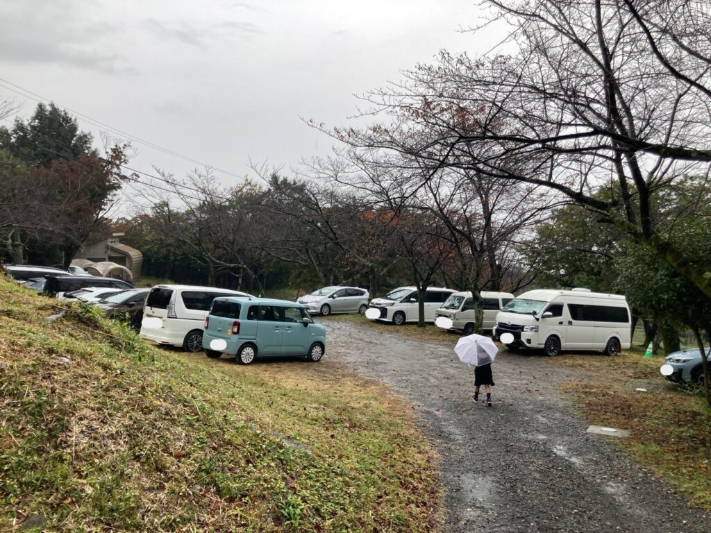 正面が「ロッジ用第1駐車場」になりますので何台か車が停まっていると思います。少し坂道になっているところを上がって行けばロッジ用管理棟になります。