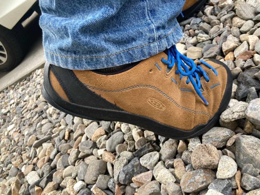 ●KEENの靴がしっかりと歩けるのはつま先のレザー部分とラバー部分に柔軟性があるからだと。しっかりとかかとから入りつま先で蹴るという体重移動ができておりそれが無駄な力を使わないようにして疲れにくさを実現しているのではないかなと思います。